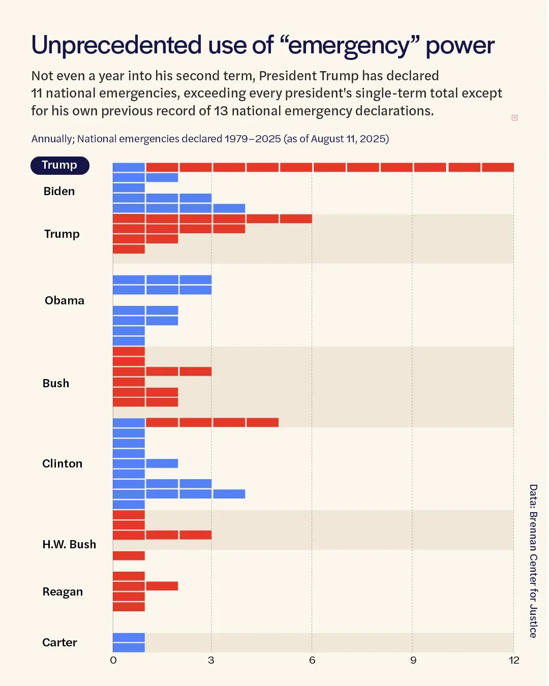 Not even a year into his second term, President Trump has (as of 11 August 2025) declared 11 national emergencies, exceeding every president’s single-term total except for his own previous record of 13 national emergency declarations during his first term.